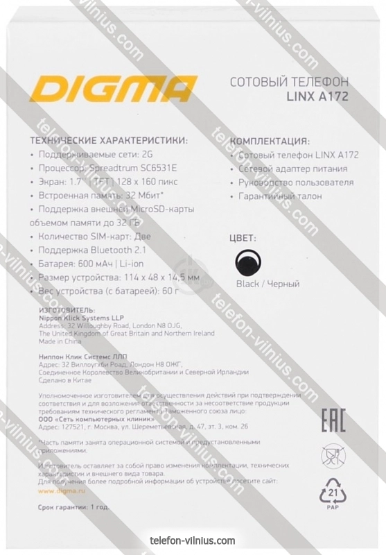 Телефон Digma Linx A172 в Вильнюсе, ЛитваБренд: Digma |
