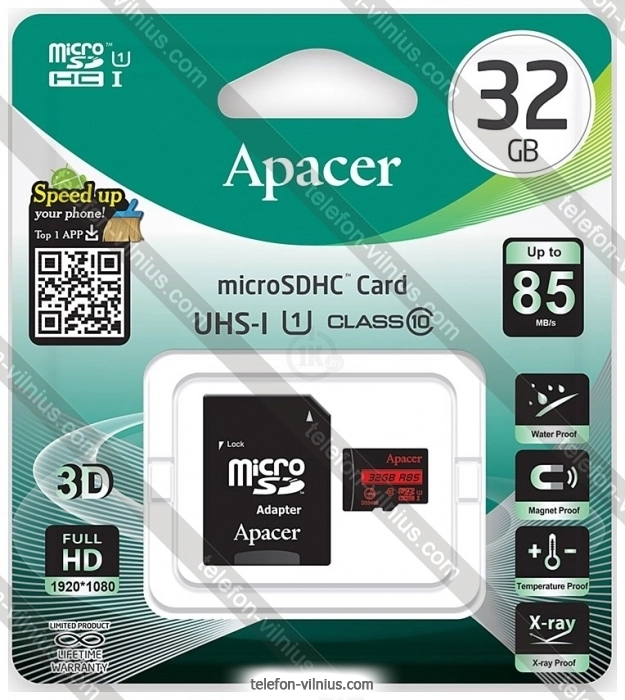 Apacer microSDHC AP32GMCSH10U5-R 32GB (с адаптером) - купить в Вильнюсе, Литва.Бренд: Apacer |