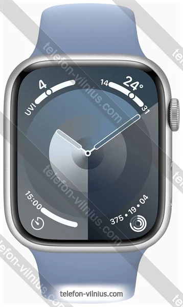 Apple Watch Series 9 45 мм (алюминиевый корпус, серебристый/зимний синий, спортивный силиконовый ремешок M/L) недорого — весенняя распродажа 2026 со скидкой 15%, г. Вильнюс, Литва.