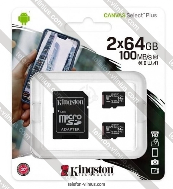 Kingston Canvas Select Plus microSDXC 2x64GB (с адаптером) - купить в Вильнюсе, Литва.Бренд: Kingston |