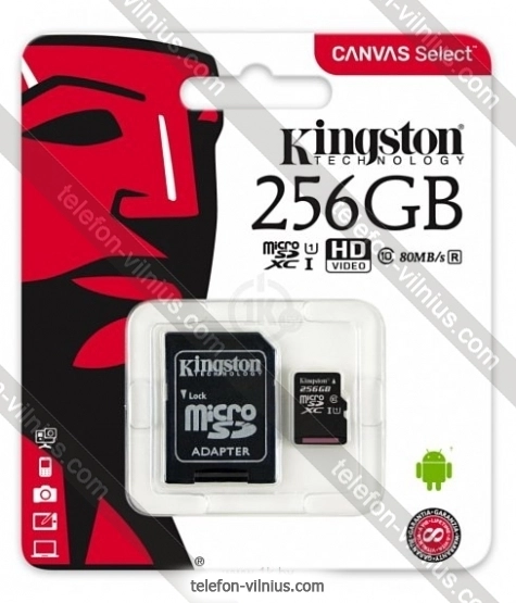 Kingston Canvas Select microSDXC Class 10 UHS-I U1 256GB + SD adapter (SDCS/256GB) - купить в Вильнюсе, Литва.Бренд: Kingston Зимняя скидка 2025 г.: 10%, экономия: 3 €